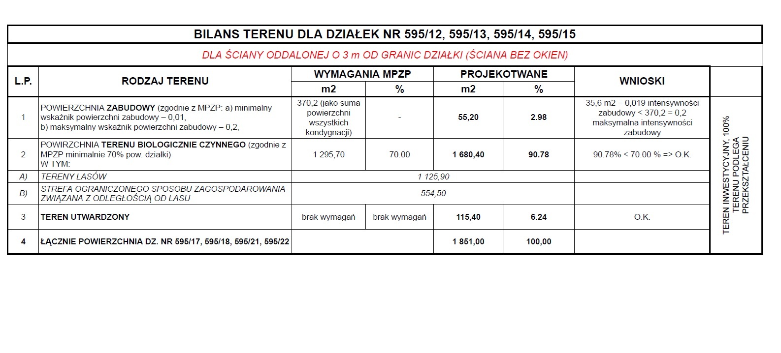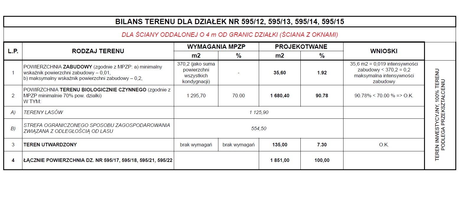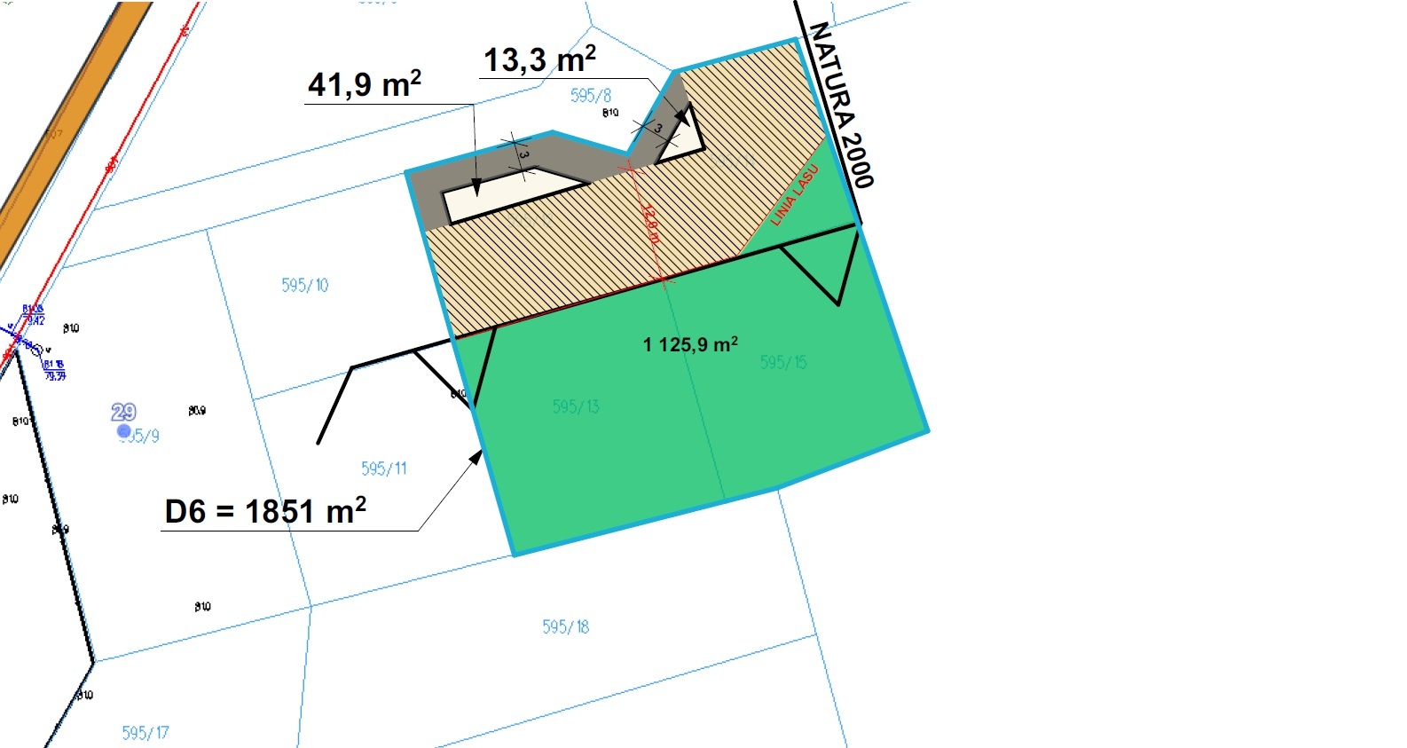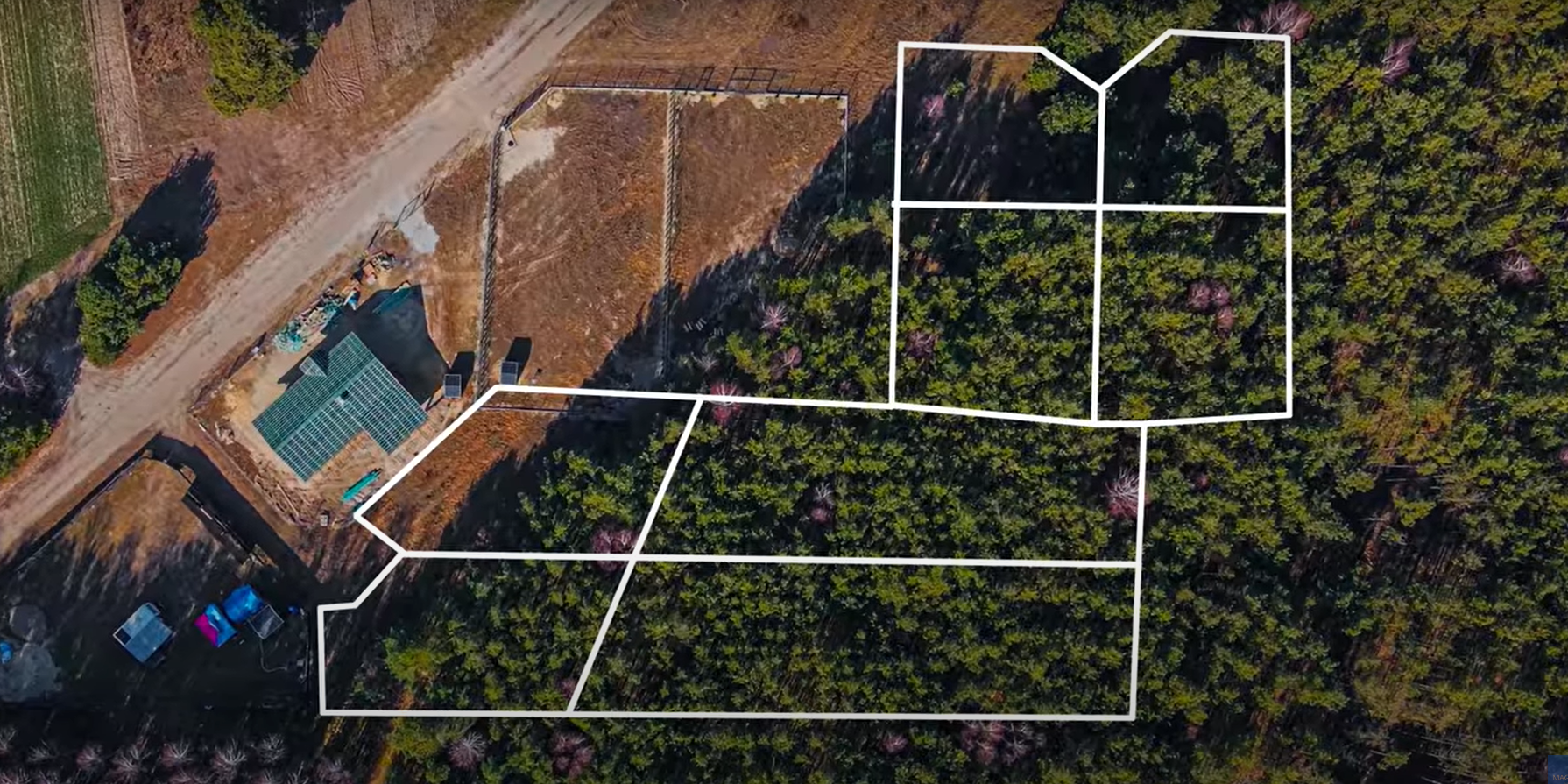 Na powierzchnię 1851 m2 składają się 4 działki: nr 595/17, 595/18, 595/21, 595/22. Ze względu na częściowe zalesienie tych działek i decyzję podziałową z urzędu i dostęp do drogi dojazdowej nie można sprzedawać każdej z tych działek samodzielnie. Sąsiednie działki są już sprzedane.