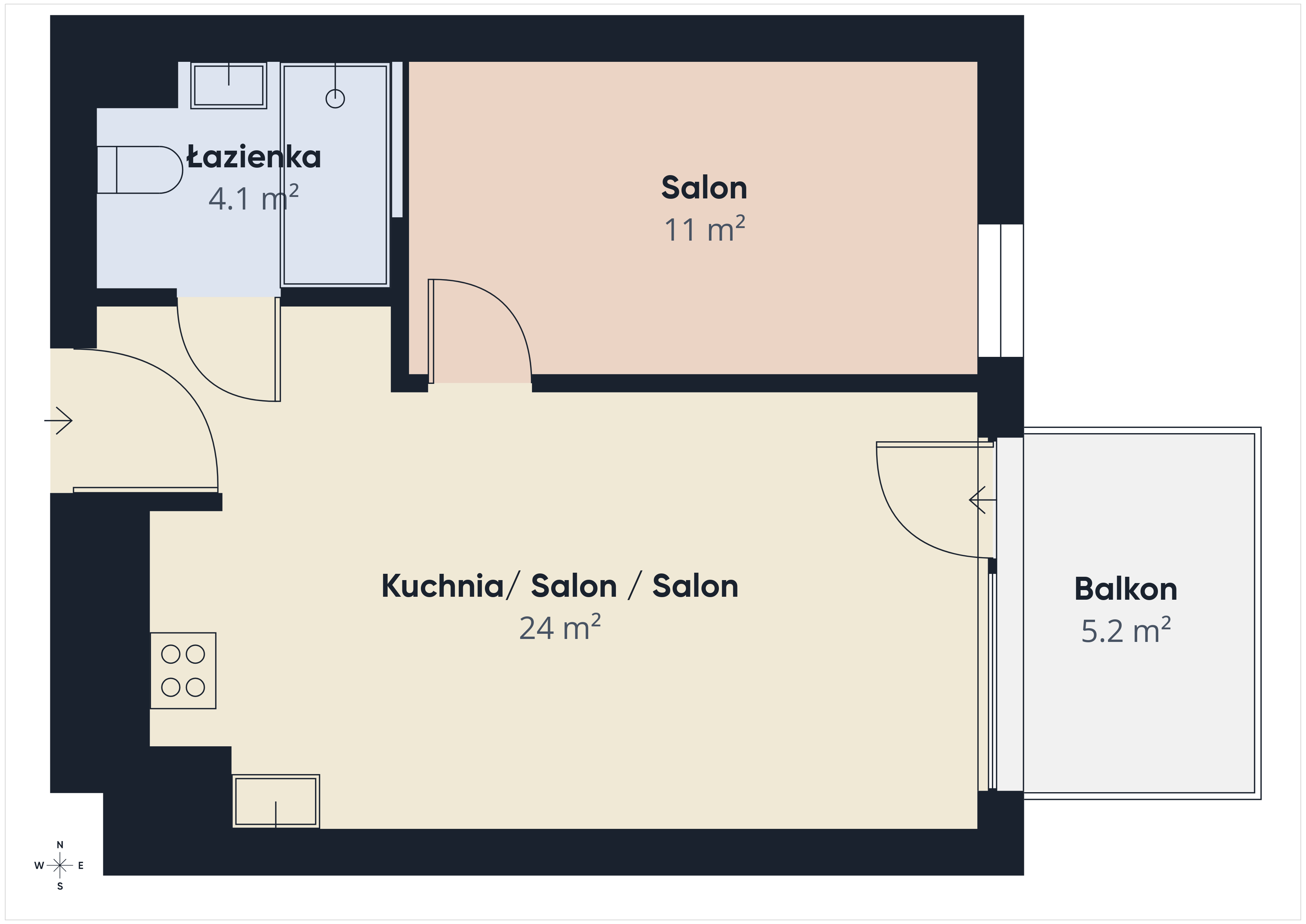 -duży, otwarty salon ze stołem jadalnianym i wyjście na balkon,