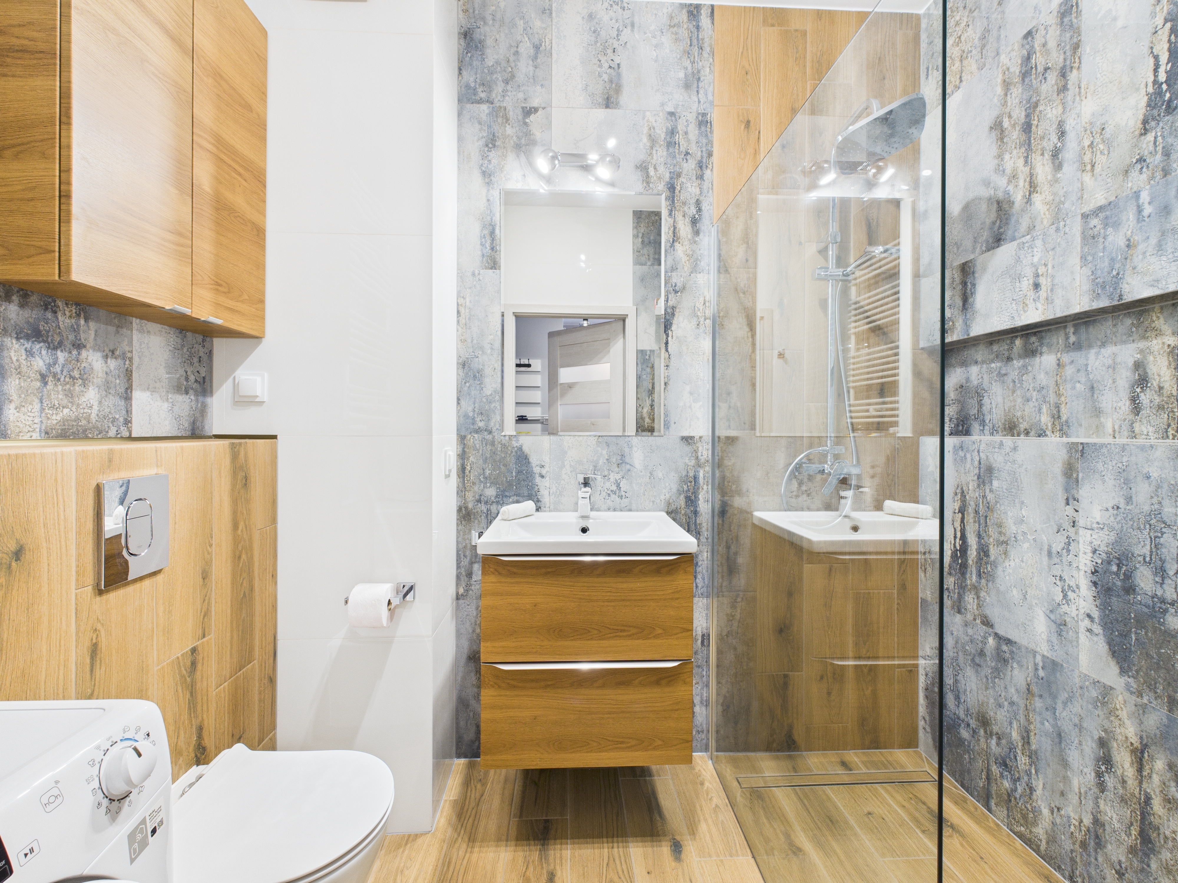-łazienka z wygodnym prysznicem, pralką i WC,