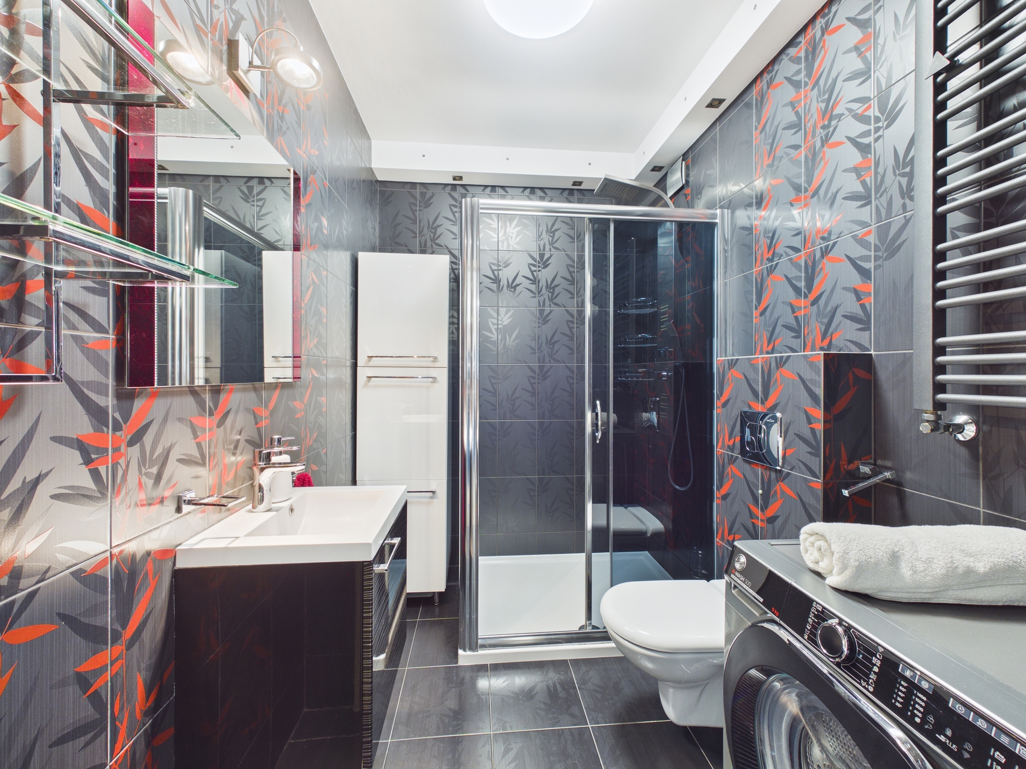 - Łazienka: Wygodna, wyposażona w dużą kabinę prysznicową, pralkę oraz funkcjonalne szafki.