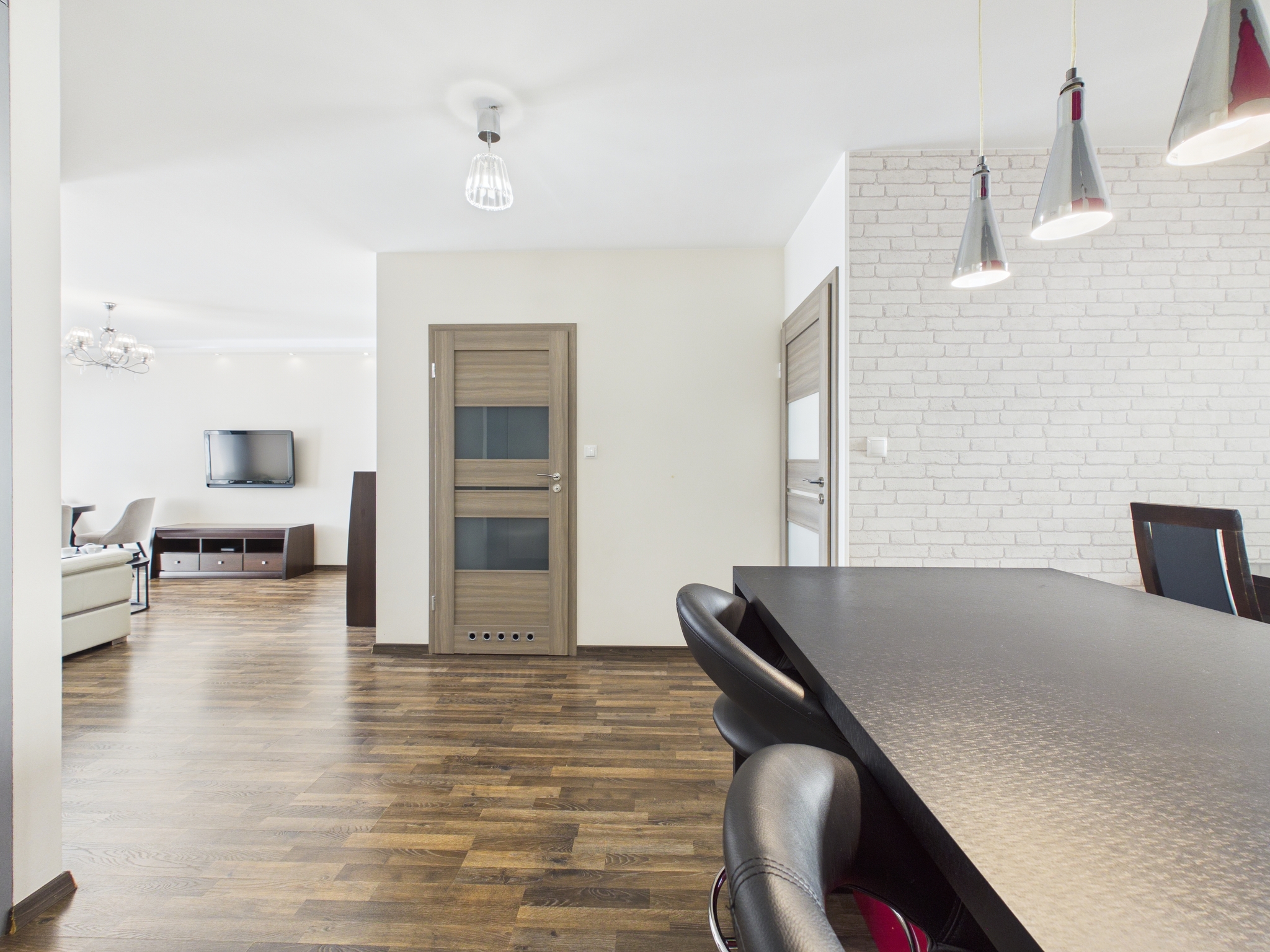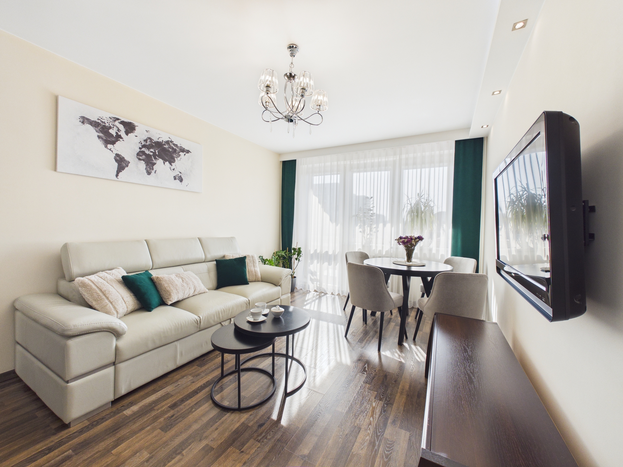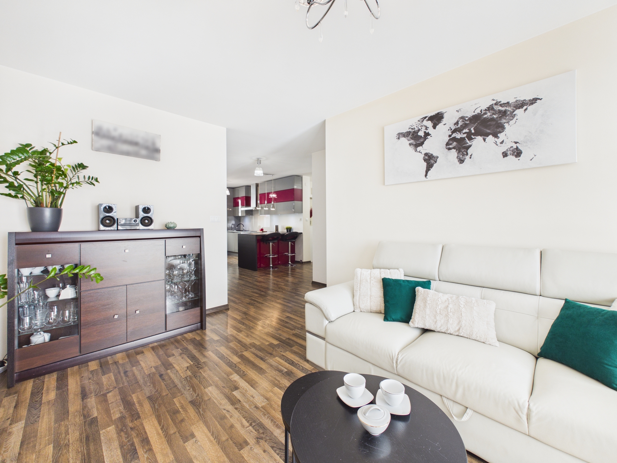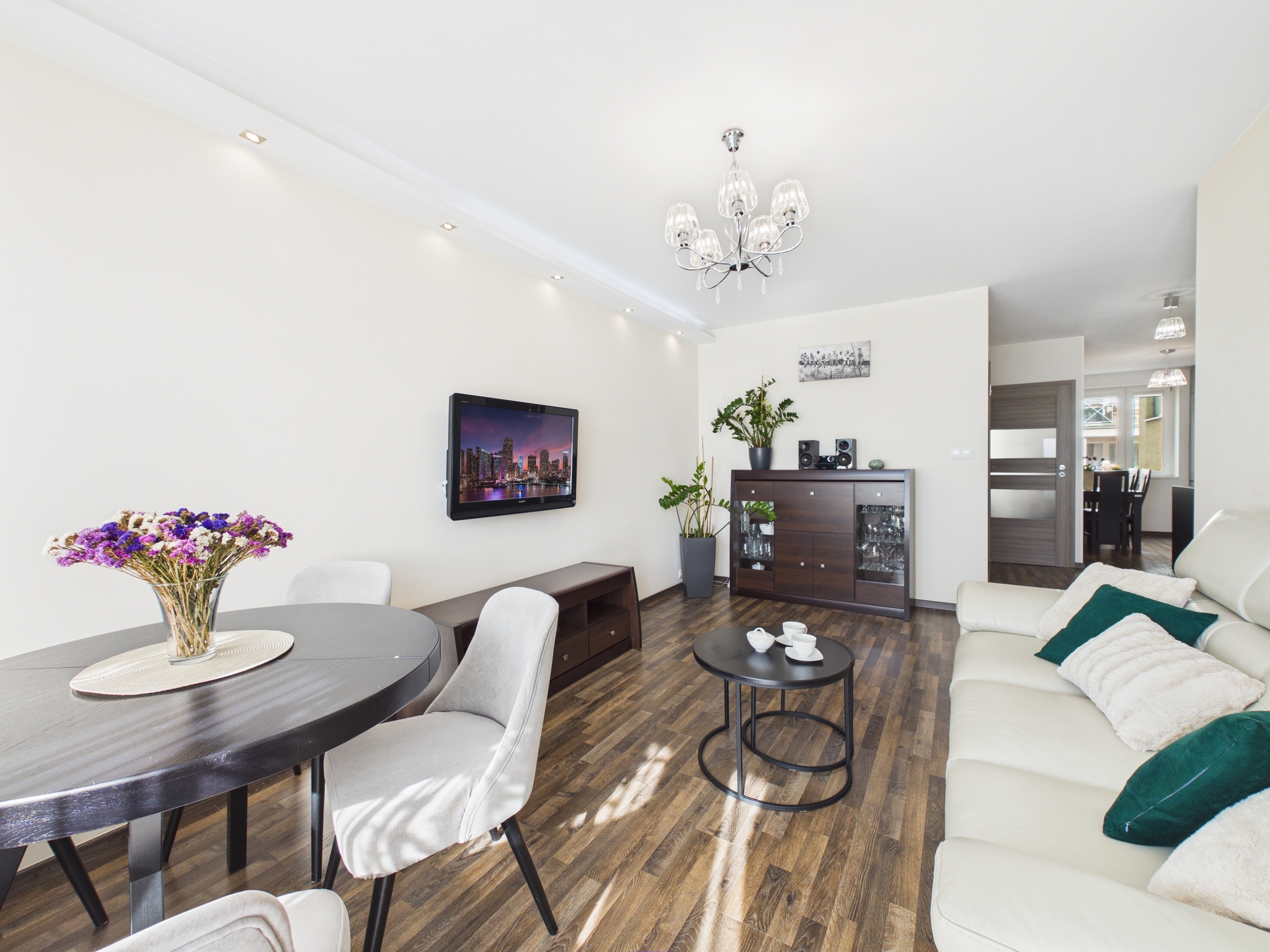 - Salon z otwartą kuchnią: Serce domu. Kuchnia z zabudową w odważnej kolorystyce, wyposażona w pełny sprzęt AGD (piekarnik, płyta grzewcza, okap, zlew z baterią podtynkową, zmywarka). Słoneczny salon z wygodną kanapą, TV oraz częścią jadalnianą. Z salonu jest wyjście na balkon.