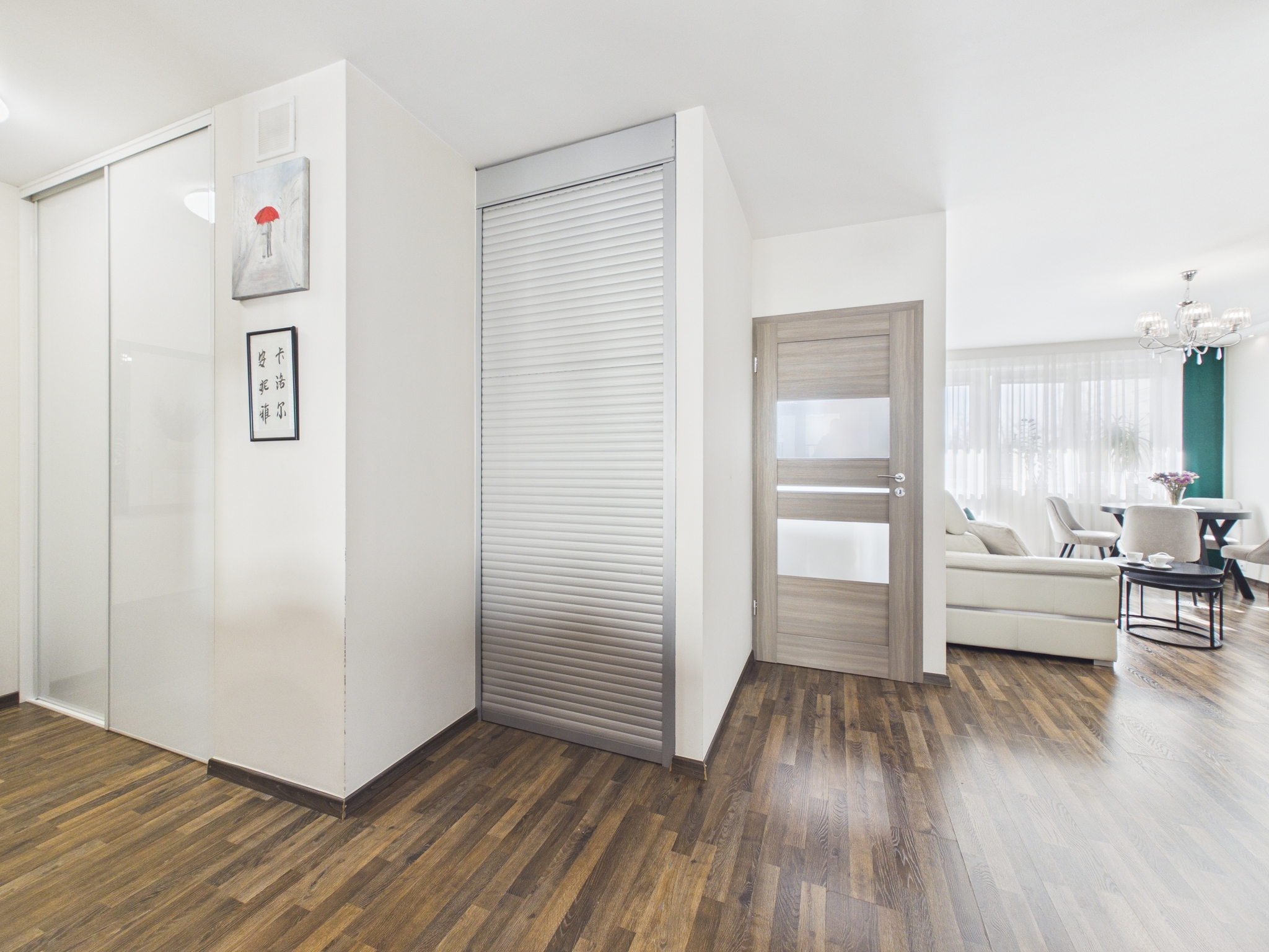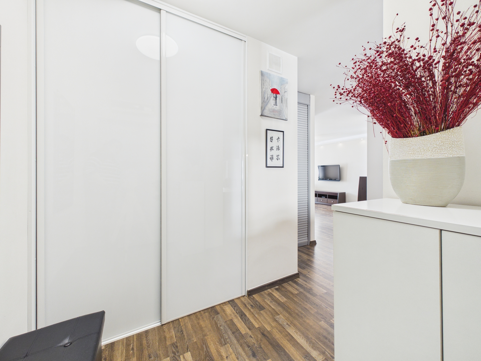 - Przedpokój: Przestronny z dużą szafa w zabudowie i schowkiem, łączący wszystkie strefy mieszkania.