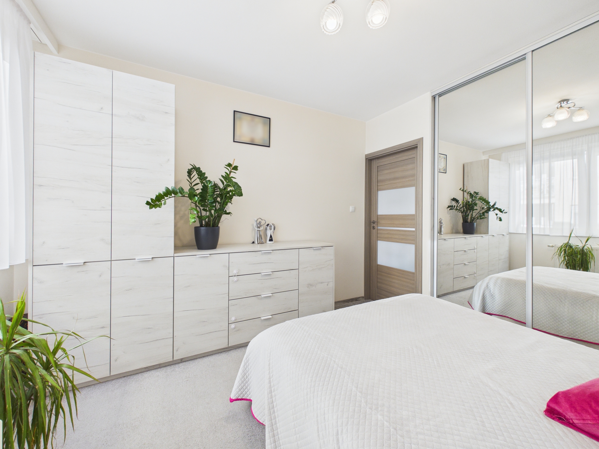 - Główna sypialnia: Komfortowa przestrzeń z dużym łóżkiem małżeńskim, pojemną szafą z lustrami oraz komodami.
