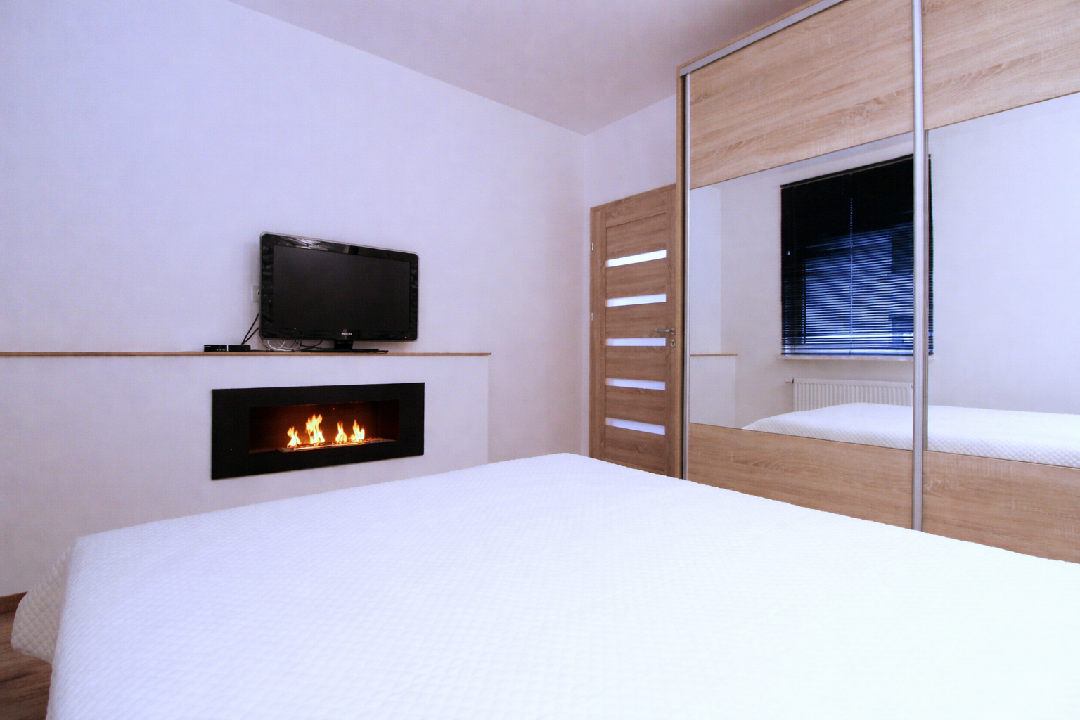 Na końcu mieszkania znajduje się główna sypialna z dużą szafą, łóżkiem, a także bio-kominkiem i TV – idealna strefa relaksu.
