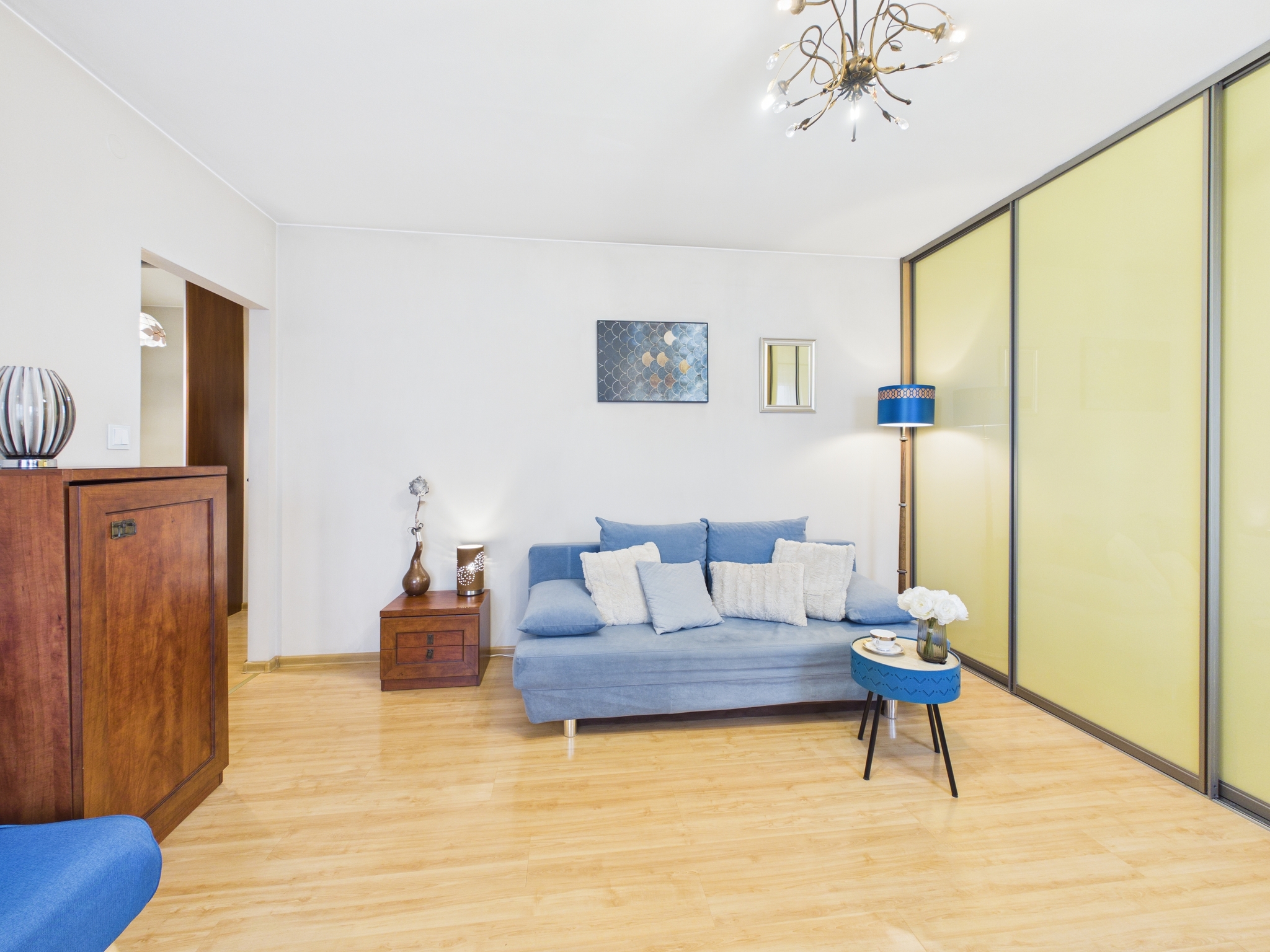 - Przestronny salon (19 m²) – jasny, ustawny pokój dzienny z wyjściem na balkon. Ekspozycja okien na wschód. Możliwość wydzielenia drugiego pokoju około 7 m²