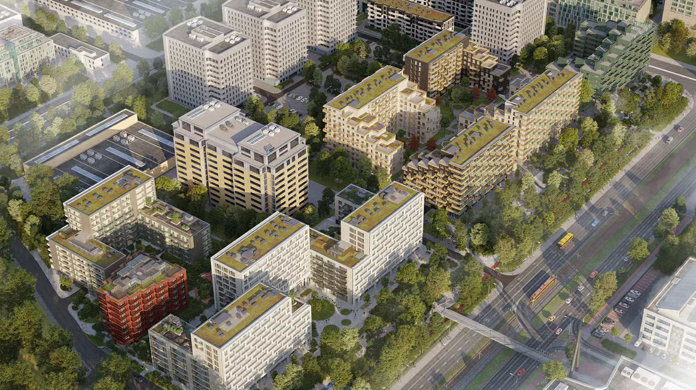 Nowoczesne osiedle z imponującą zieloną przestrzenią — aż 1,5 ha miejskiego parku wzdłuż Wołoskiej oraz 2,1 ha zieleni na terenie inwestycji.